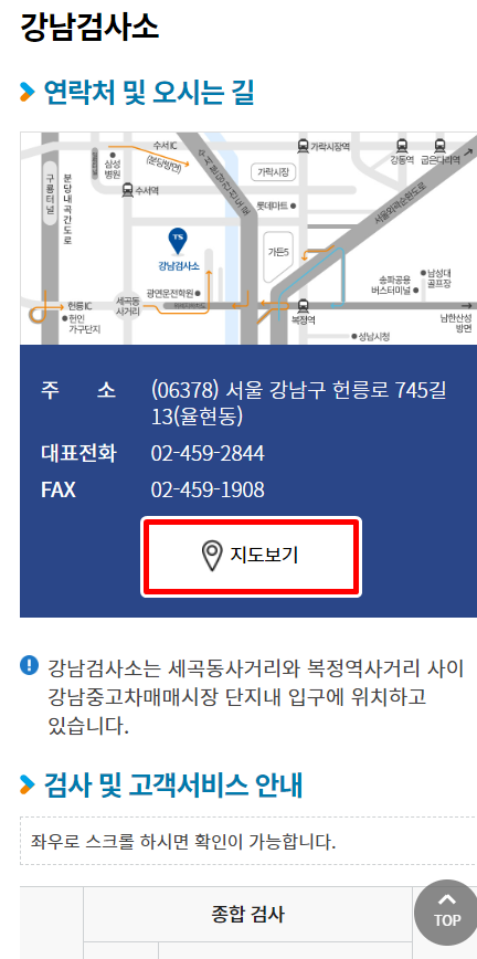 7. 검사소의 상세 주소와 대표전화 정보가 나와요. 지도보기를 누르면 지도로 해당 검사소의 위치를 네비로 찍어볼 수 있어요.