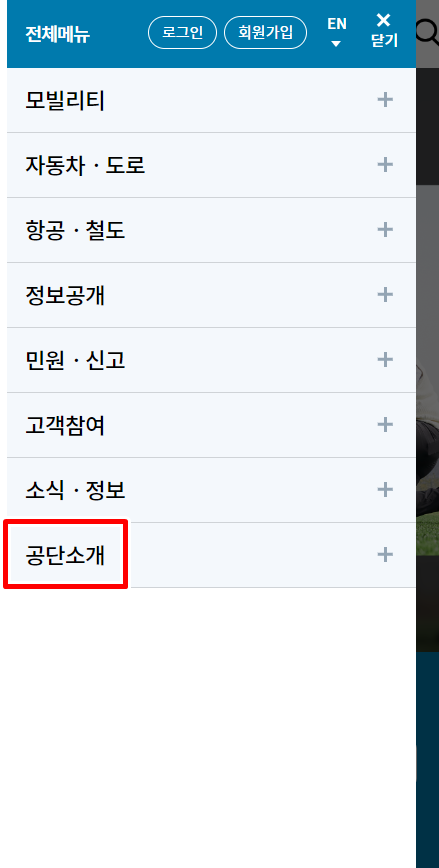 2. 메뉴창이 열리면 공단소개 메뉴를 선택하세요.