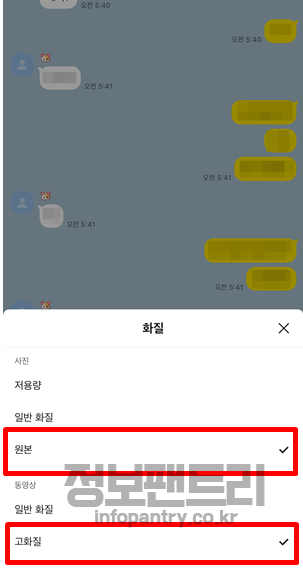 5. 전송할 사진의 화질을 설정할 수 있는 창이 아래와같이 뜹니다. 원본에 체크해주시면 앞으로 전송하는 모든 사진이 원본으로 전송됩니다. 동영상의 화질 역시 설정할 수 있는데요, 동영상의 경우 고화질로 전송하면 데이터를 많이 소모할 수 있어 상황에 맞게끔 선택해보시기 바래요.
