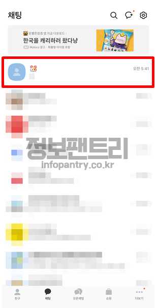 1. 카카오톡을 실행하시고 채팅에서 대화방을 선택해서 들어가주세요.