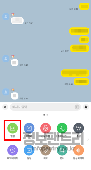 3. 카메라, 선물하기, 통화하기, 송금 등 다양한 메뉴들이 보여지는데요, 그 중 사진을 전송할 수 있는 앨범 메뉴를 선택하세요.