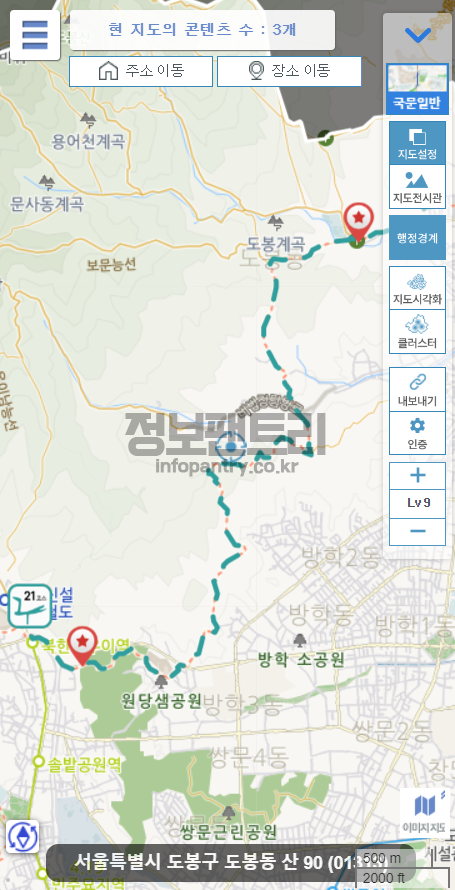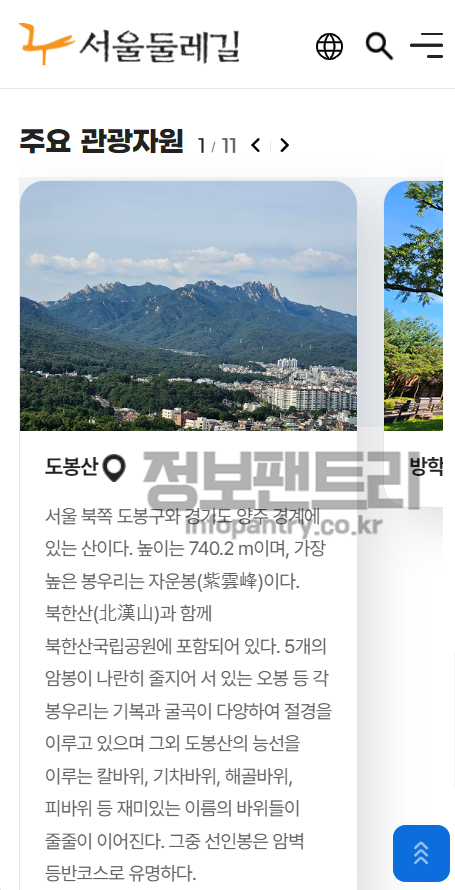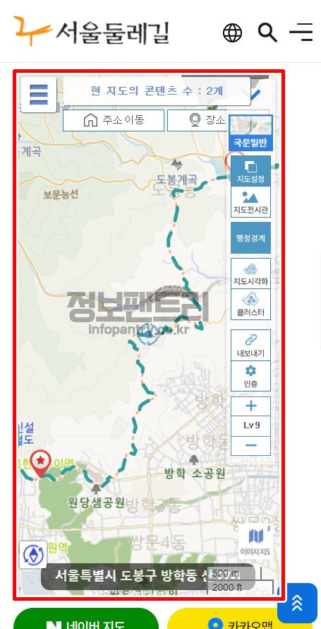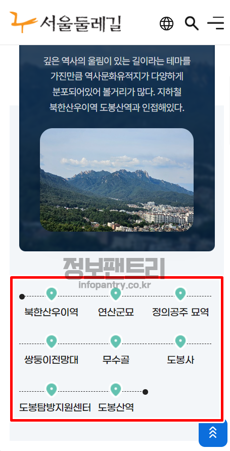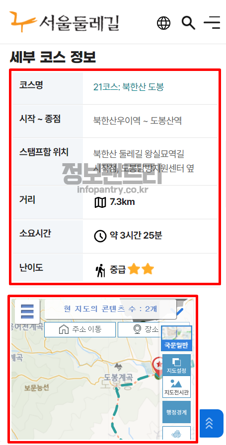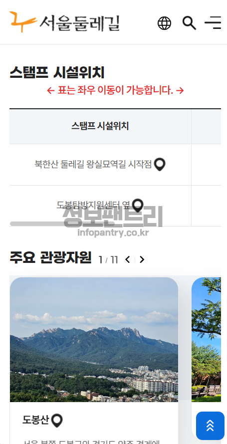 9. 다시 등산코스 정보로 돌아오시면 자세한 코스 진입 방법, 그리고 스탬프 시설위치를 볼 수 있어요.