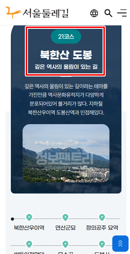 6. 제가 원하는 출발지와 도착지는 21코스 북한산 도봉 등산코스가 추천되었네요. 코스정보를 보면 중급 코스이고, 깊은 역사와 울림이 있는 길 이라는 설명이 나와요. 역사문화유적지가 다양하여 볼거리가 많은 코스라고 합니다. 출발지 도착지 모두 지하철 역과 인근해있어 접근성도 좋네요.
