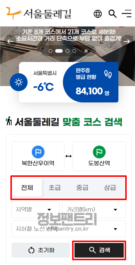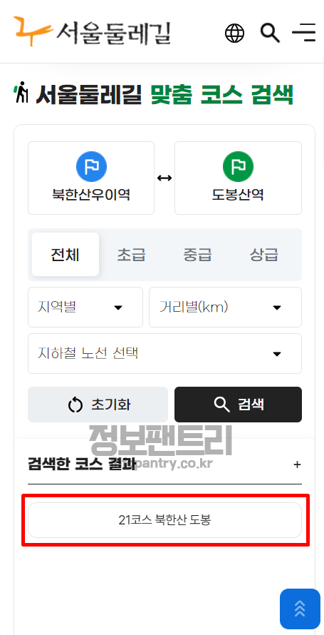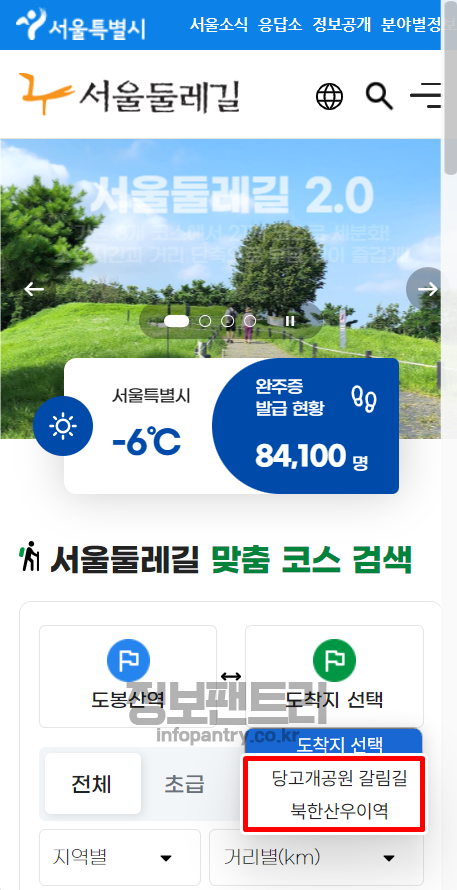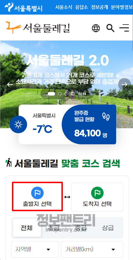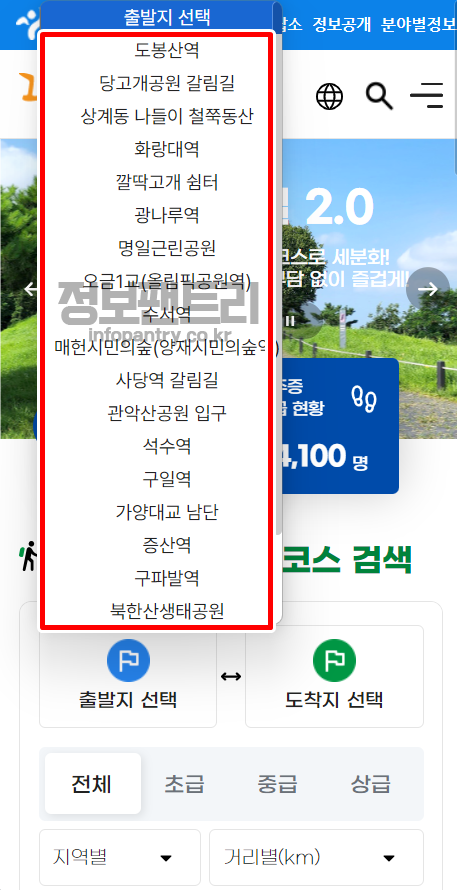 1. 서울둘레길 https://gil.seoul.go.kr 로 들어가셔서 서울둘레길 맞춤 코스 검색에서 출발지 선택 메뉴가 있습니다.