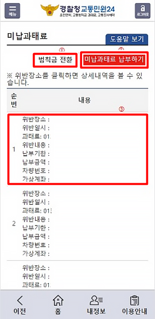 4. 미납과태료 메뉴를 선택하시면 나오는 화면이에요. 범칙금 전환으로 들어가시면 미납과태료를 범칙금으로 전환할 수 있구요, 미납과태료 납부하기 버튼으로 들어가시면 미납과태료를 납부하실 수 있어요. 위반장소로 들어가시면 상세내역도 확인하실 수 있습니다.