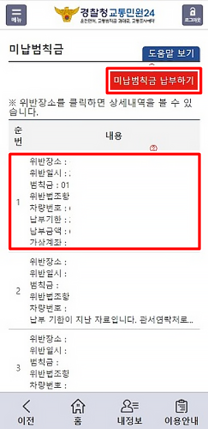 5. 마지막으로 미납범칙금 메뉴로 들어가시면 보이는 화면인데요, 미납범칙금 납부하기로 범칙금을 납부하실 수 있구요, 역시 상세내용은 위반장소를 선택하셔서 확인해보실 수 있어요.