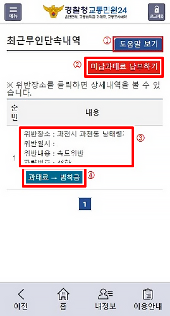 3. 최근무인단속내역으로 들어가시면 나오는 화면입니다. 먼저 위반장소를 누르면 상세내역을 확인해보실 수 있고, 미납과태료 납부하기 버튼을 통해 과태료 납부를 진행하실 수 있어요. 과태료→범칙금 버튼은 과태료를 범칙금으로 전환할 수 있어요.