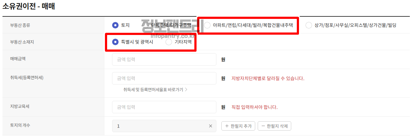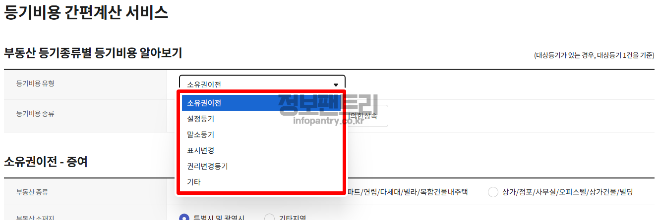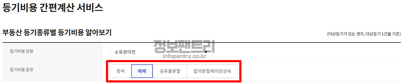 4. 이 곳에서 아파트 등기비용 자동계산 수수료를 계산해볼 수 있어요. 먼저 등기 유형을 선택해보세요.