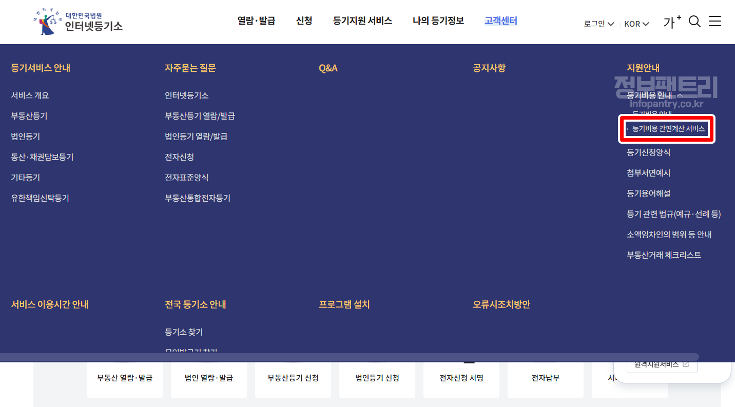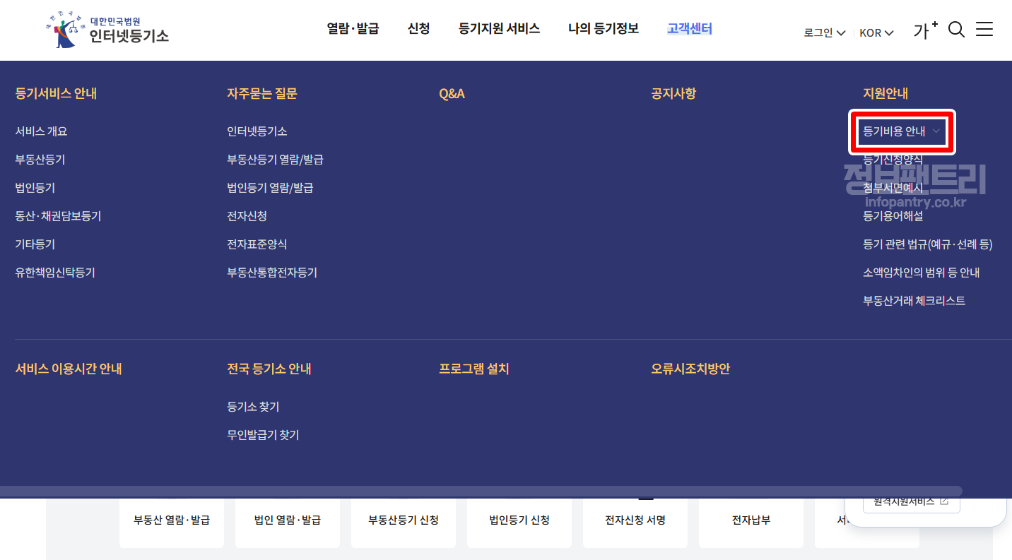 2. 메뉴창이 열리면 지원안내 아래에 등기비용 안내를 선택해주세요.