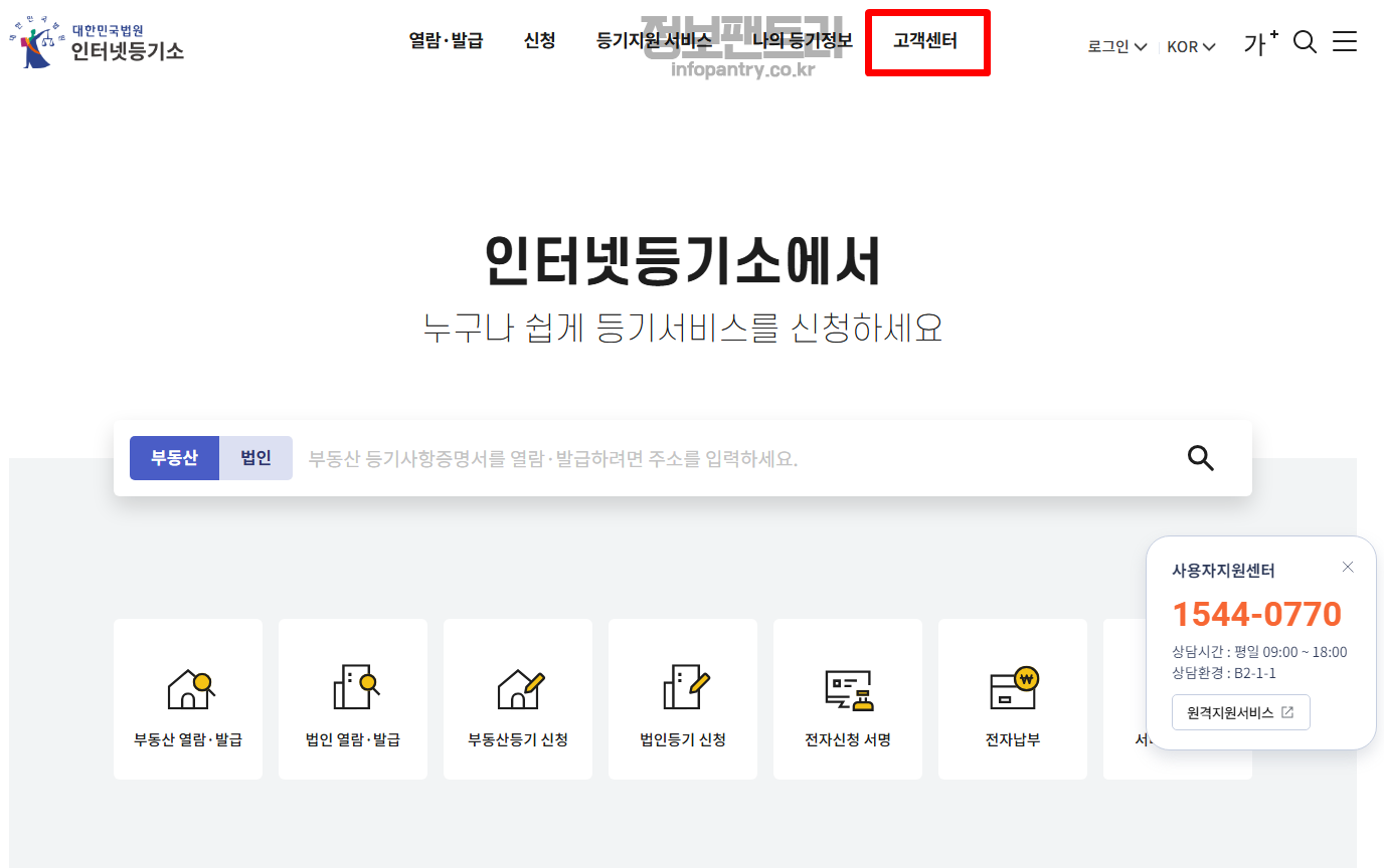 1. 인터넷등기소 메인화면 상단 메뉴에 고객센터를 선택해주세요.