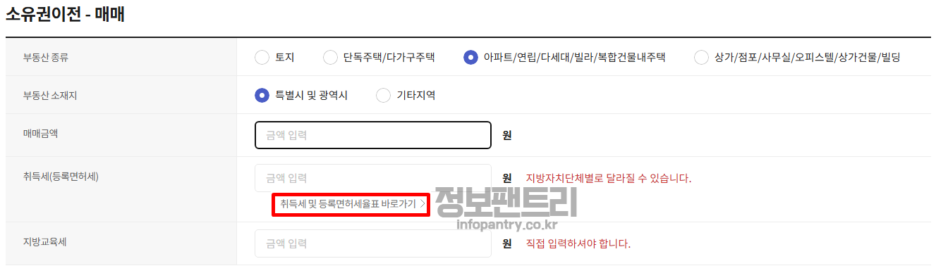 8. 매매금액과 취득세(등록면허세)를 입력해주세요. 취득세 금액을 모르실경우 취득세 및 등록면허세율표 바로가기로 들어가보시면 계산표를 볼 수 있어요.