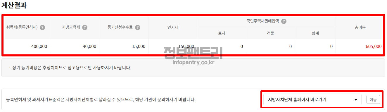 11. 취득세, 지방교육세, 등기신청수수료, 인지세 총 비용 계산결과를 확인하실 수 있어요. 더 궁금한 사항은 지방자치단체 기관에 문의하실 수 있는데요, 지방자치단체 홈페이지 바로가기에서 지역을 선택하여 바로 이동하여 문의해보실 수도 있답니다.