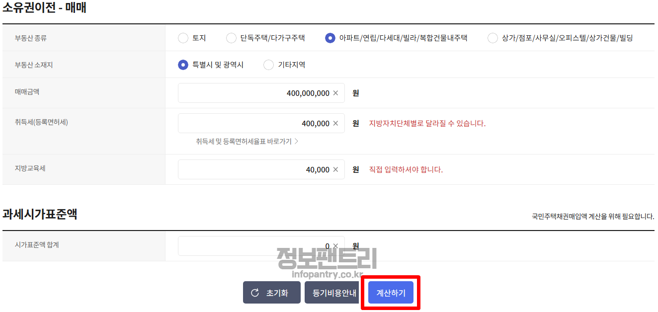 9. 지방교육세를 입력해주세요. 6억원 이하일 경우 취득세는 매매금액의 1%, 지방교육세는 0.10%로 입력해주시면 간단하실거에요. 마지막으로 계산하기 진행해주세요.