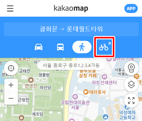 11. 마지막으로 자전거 아이콘을 선택하시면 자전거 전용도로 및 자전거 주행 가능한 길안내를 알아보실 수 있는데요, 해당 기능은 카카오맵 앱에서만 이용이 가능하네요. 궁금하신 분들은 한 번 이용 해보세요.