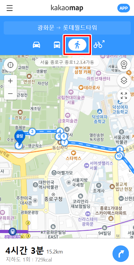 10. 사람모양 아이콘을 선택해보시면 도보 길안내가 나와요. 산책 및 초행길에 큰길 위주로 길안내를 보면서 걸어보세요.