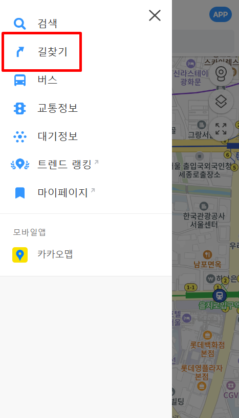 2. 왼쪽 메뉴창이 열리면 두번째 줄에 길찾기 메뉴로 들어갑니다.