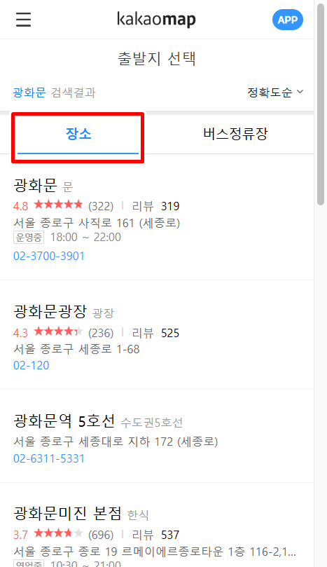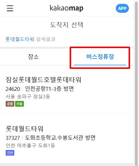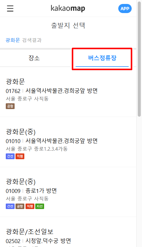 4. 출발지명을 검색하신 후 장소를 선택하셔도 되고, 버스정류장으로 검색하시면 더 간편하게 장소를 찾을 수 있더라구요.