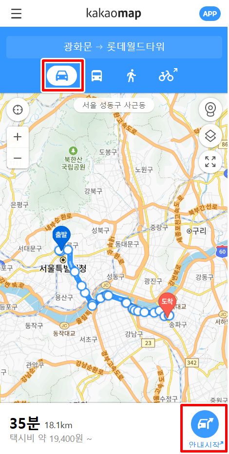 8. 먼저 차량 아이콘을 선택하시면 네비게이션 모드로 전환하며 길찾기를 안내해줍니다.