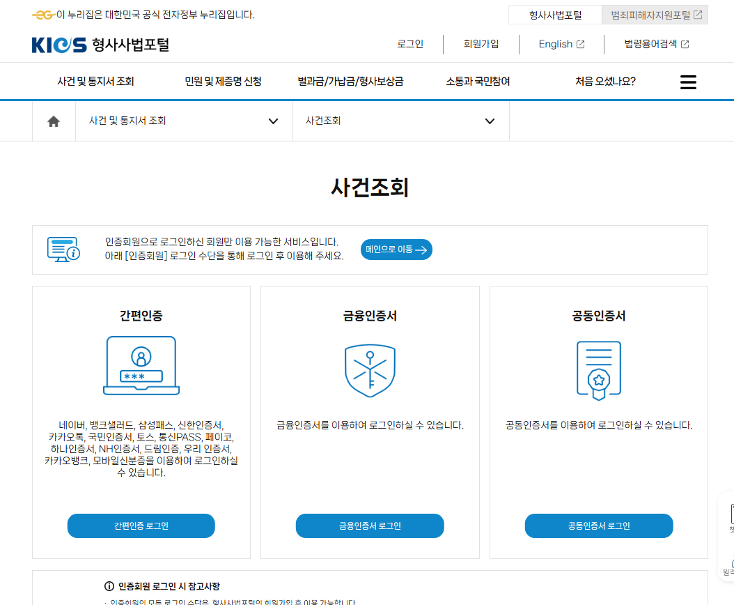 2. 검찰청 사건조회는 형사사법포털 홈페이지에서 가능하기 때문에 아래와 같이 KIOS 형사사법포털 사건조회 화면으로 이동이 될거에요. 아무래도 개인정보가 담긴 민감한 정부 민원서비스 이다 보니, 인증서를 통한 로그인을 진행해야만 검찰청 사건 번호 조회 서비스를 이용하실 수 있어요.