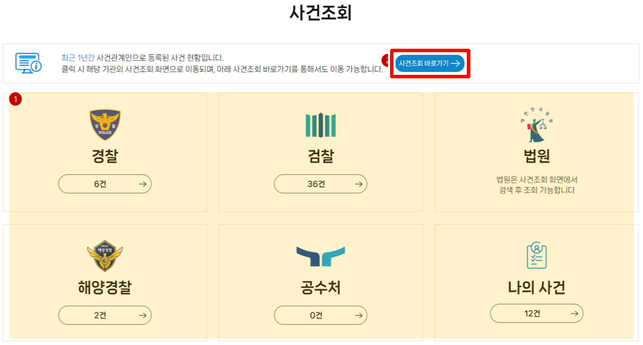 3. 인증서 로그인 후 사건조회 화면이 나올거에요. 최근 1년간 사건관계인으로 등록된 사건 현황들이 보여지는데요, 해당 기관명을 선택하시면 해당 기관의 사건조회 화면으로 이동하여 조회하실 수 있어요. 검찰청 사건 번호 조회를 하시려면 사건조회 바로가기로 들어가세요.