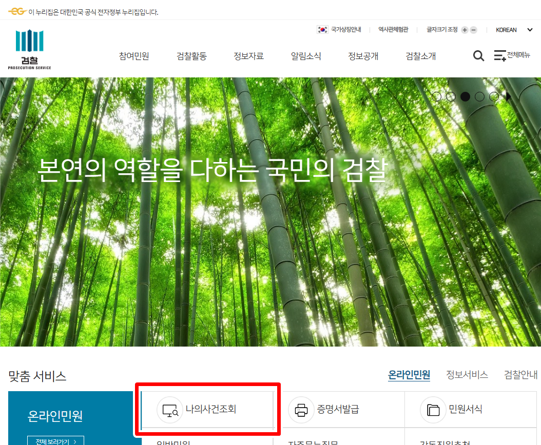 1. 대검찰청 공식홈페이지에 접속해주세요. 메인화면에서 맞춤서비스에 보시면 나의사건조회 메뉴로 들어가세요.