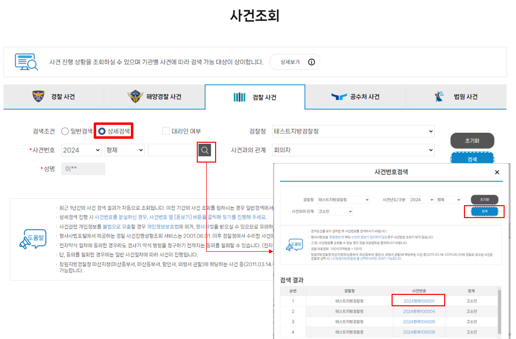 5. 상세검색을 선택하시면 대리인여부, 사건 검찰청, 사건번호, 사건과의 관계 등 자세한 내용을 입력하여 검색해볼 수 있어요.