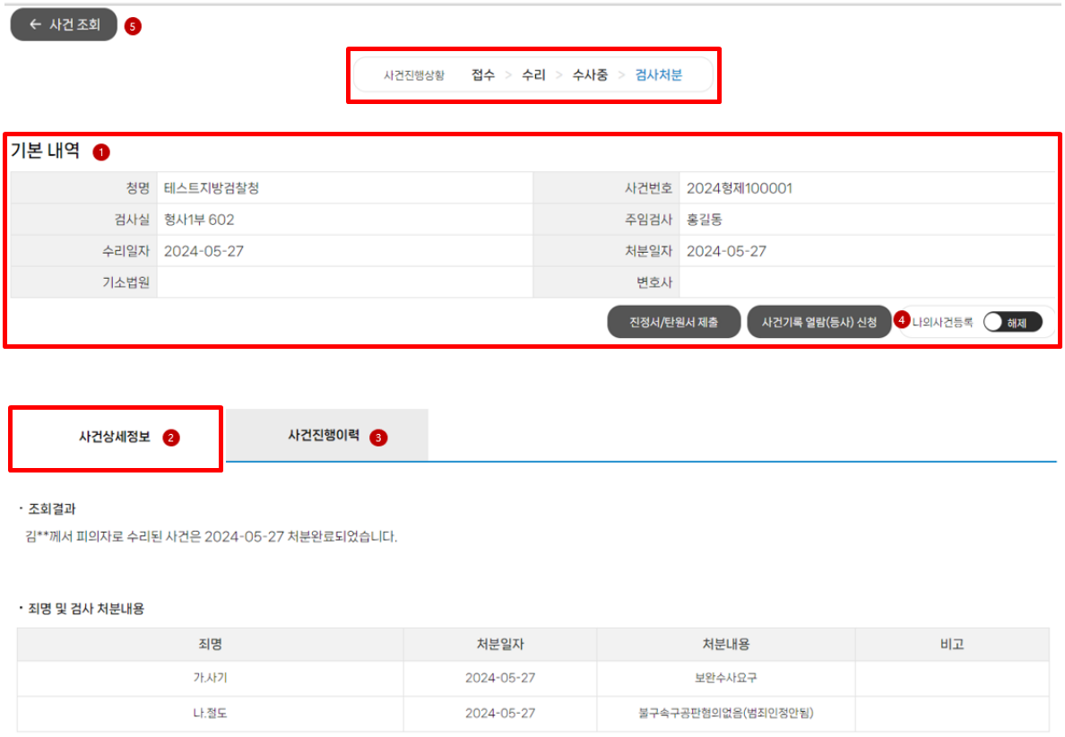 사건상세정보 : 죄명 및 검사 처분내용을 상세하게 안내해줍니다. 검찰 송치의견, 사건진행상황, 사건진행내역 수사 결과 등 자세한 내역과 결과를 확인하세요.