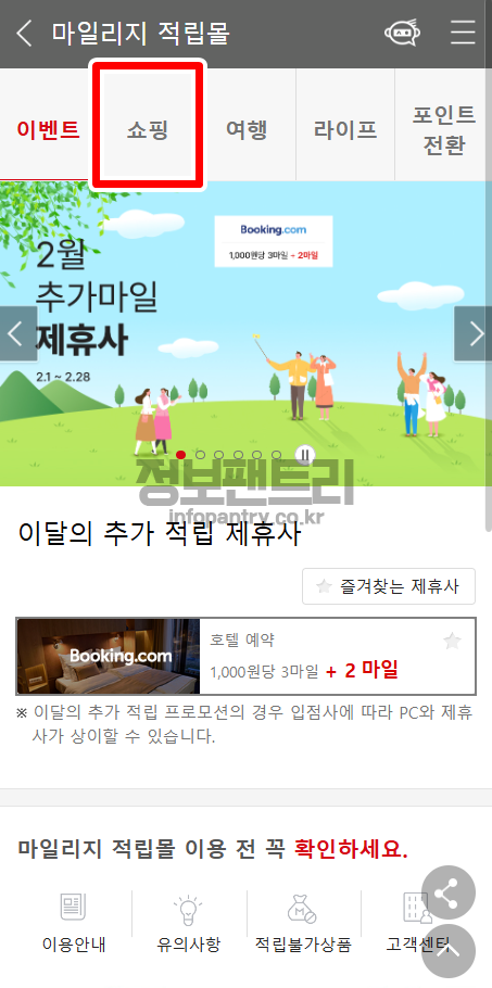 1. 아시아나항공 마일리지 적립몰로 들어가셔서 쇼핑 메뉴로 들어가세요.