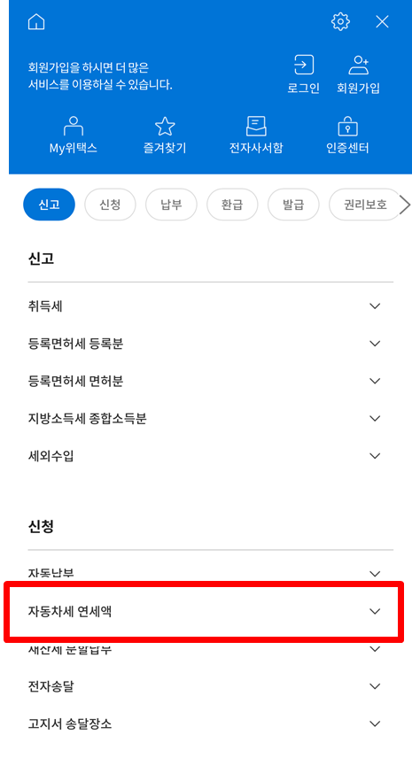 3. 메뉴창으로 들어오시면 신청 메뉴에 자동차세 연세액 메뉴가 있어요.