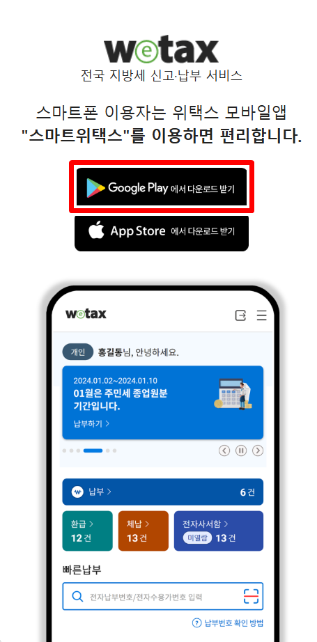 1. 스마트폰에서 모바일로 스마트 위택스로 들어가시면 위택스 모바일앱 안내 화면이 나타나요. 앱 설치를 진행 해주세요.