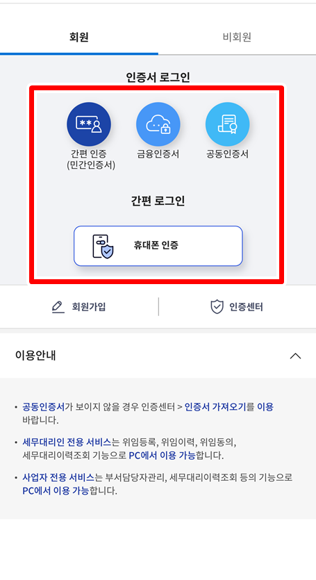 5. 인증서 로그인 또는 휴대폰인증 간편로그인 후 이용하시면 됩니다.
