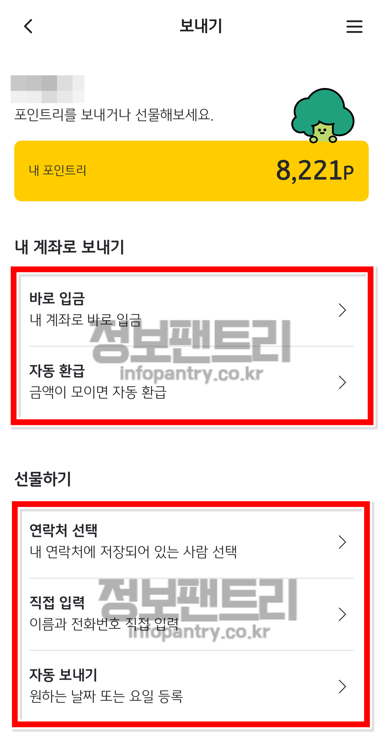 국민카드 포인트를 내 계좌로 보내는 바로 입금 서비스와 자동 환급 서비스가 있어요. 바로 입금은 실시간으로 내 계좌에 포인트를 입금하는 방법이고, 자동 환급은 일정 금액이 모이면 자동으로 내 통장에 포인트가 현금으로 입금되는 서비스에요. 그리고 내 포인트를 선물할 수 있는 선물하기 서비스가 있어요. 가족이나 형제자매, 친구 등 지인들의 연락처를 입력하여 포인트를 선물할 수 있답니다.
