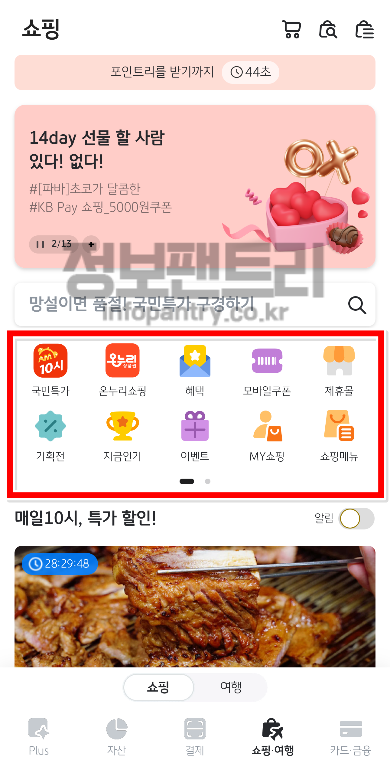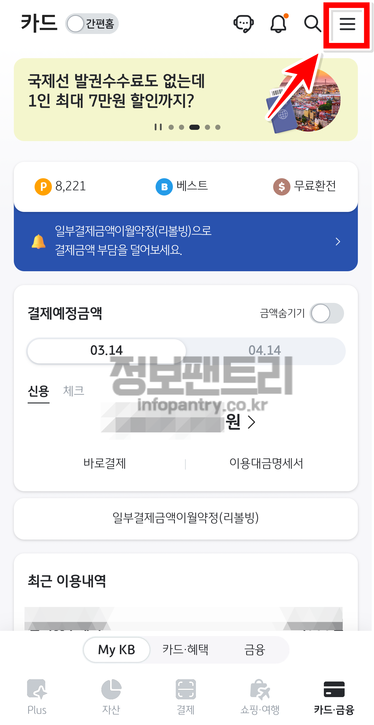 1. 국민카드 공식 앱 KB PAY를 실행해서 열어주세요. 메뉴 창을 열어주세요.