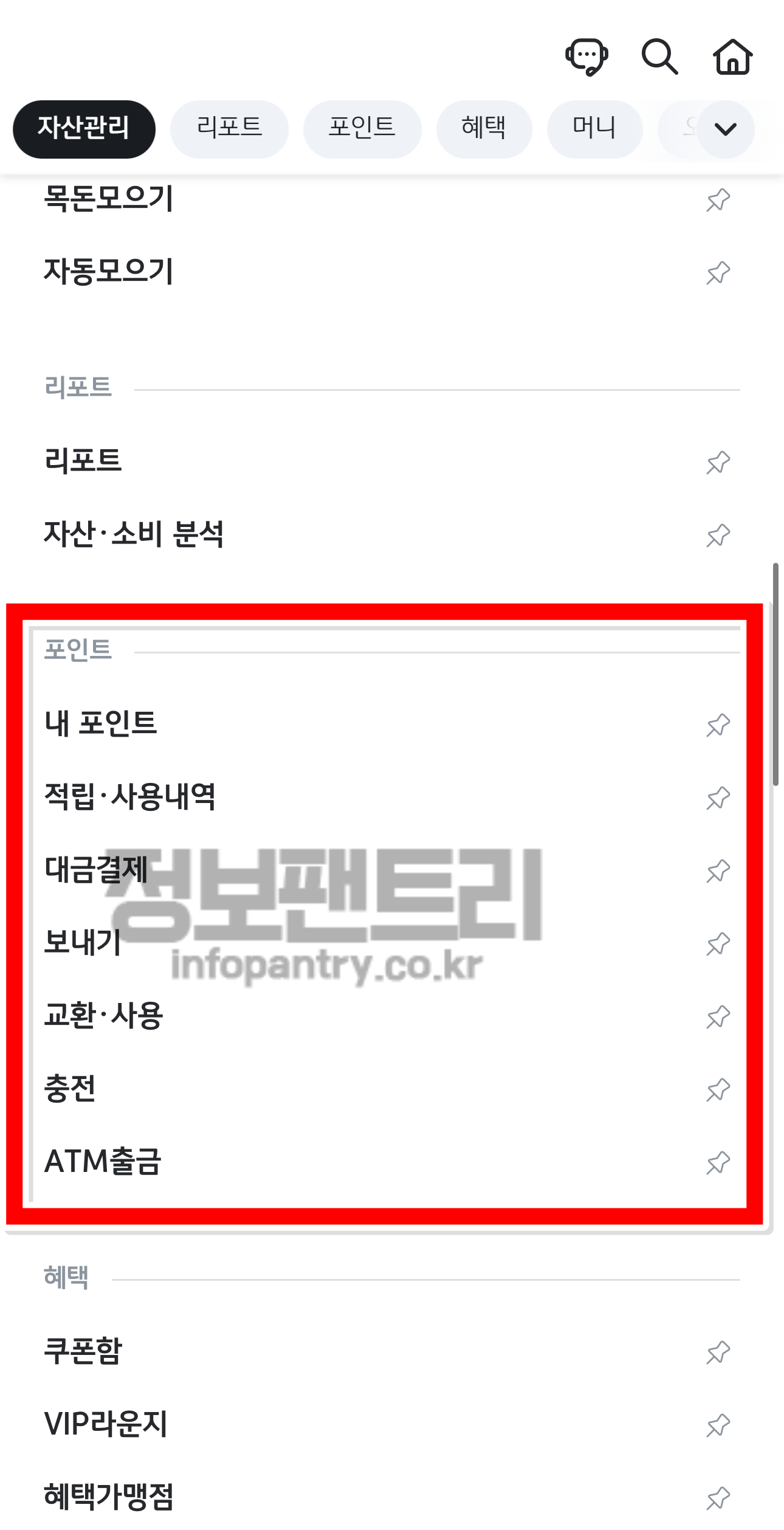 2. 메뉴창 화면을 아래로 내려주시면 포인트 메뉴가 있어요. 포인트 서비스 이용 방법을 하나하나씩 알려드릴게요.