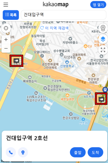 3. 건대입구역을 검색하면 지하철역 정보와 함께 관련 장소들이 나옵니다. 주소와 연락처도 함께 나와 있어서 원하는 정보를 쉽게 확인할 수 있습니다. 지도 보기와 길 찾기 기능이 따로 있어 이동 경로를 빠르게 파악할 수 있는 점도 편리하네요. 여기서 지도 보기를 선택 합니다.