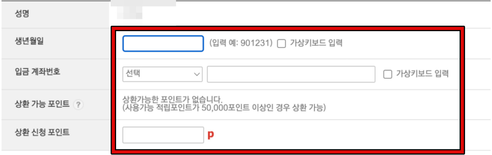 5. 이제 필요한 정보를 입력하면 됩니다. 이름, 생년월일, 입금받을 계좌번호를 입력한 후 전환할 포인트 금액을 설정하고 신청을 완료하면 됩니다. 모든 정보를 정확히 입력했는지 확인한 후 진행하세요.