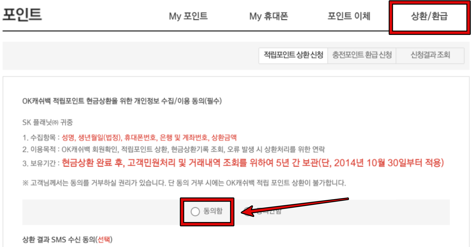 4. 포인트 상환 및 환급 페이지에 들어왔다면 먼저 개인정보 수집 및 이용 동의 항목을 확인해야 합니다. 내용을 읽고 동의란에 체크를 하면 다음 단계로 진행할 수 있습니다.