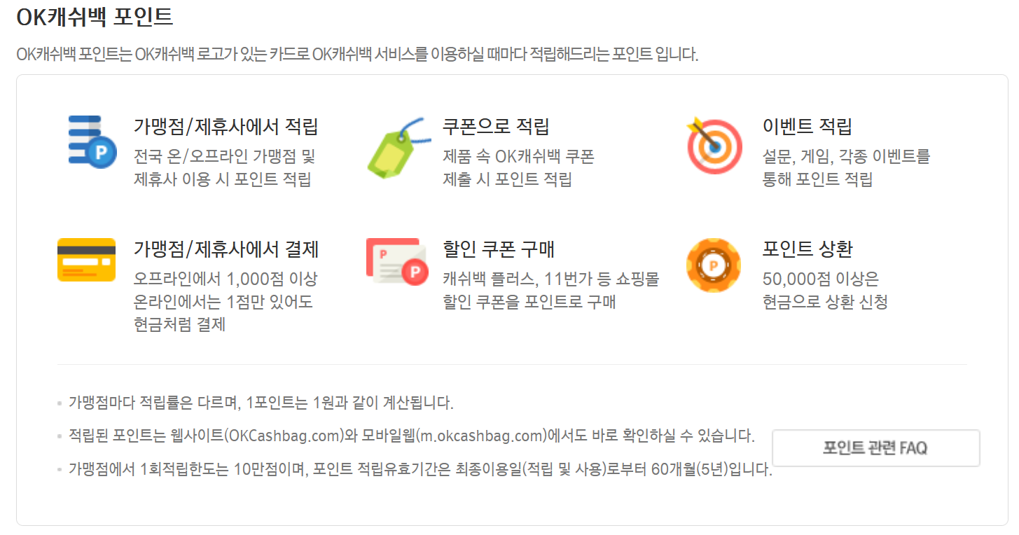 7. OK캐쉬백 포인트는 다양한 방법으로 적립하고 사용할 수 있습니다. 전국 온·오프라인 가맹점 이용 시 포인트가 쌓이며 제품 속 쿠폰을 제출하거나 설문, 게임 등의 이벤트를 통해서도 적립할 수 있습니다. 적립한 포인트는 가맹점에서 결제할 때 사용할 수 있으며 온라인에서는 1P부터 활용이 가능합니다. 또한 할인 쿠폰을 구매할 수도 있으며 포인트 유효기간은 마지막 사용일부터 5년입니다.