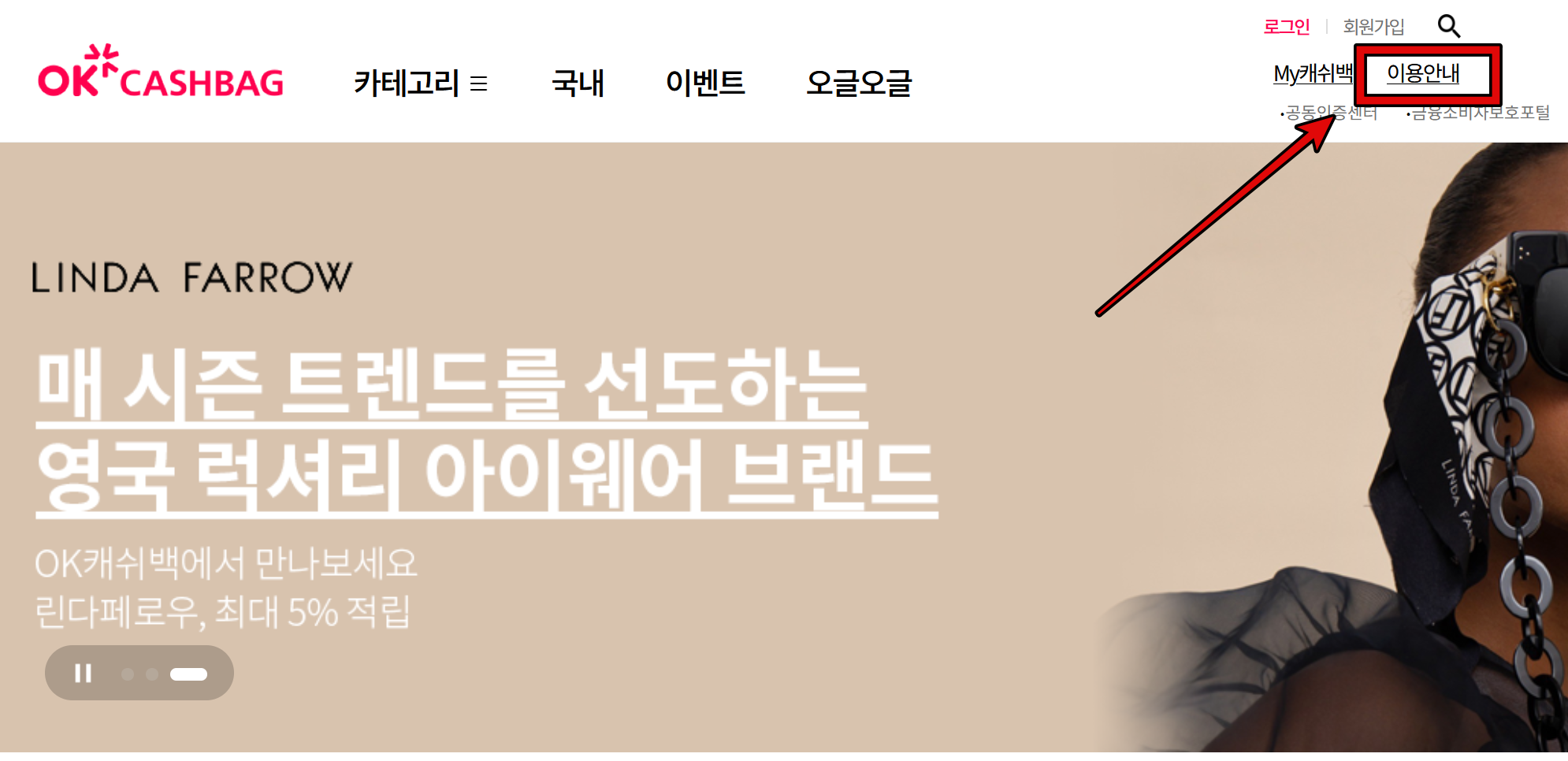1. OK캐쉬백 공식 사이트에서는 포인트 조회, 가맹점 정보, 카드 및 쿠폰 사용법, 포인트 적립 방법, 이벤트 안내 등을 확인할 수 있습니다. 포인트를 현금으로 바꾸고 싶다면 화면 상단 오른쪽에 있는 이용안내 메뉴를 찾아 눌러주세요.