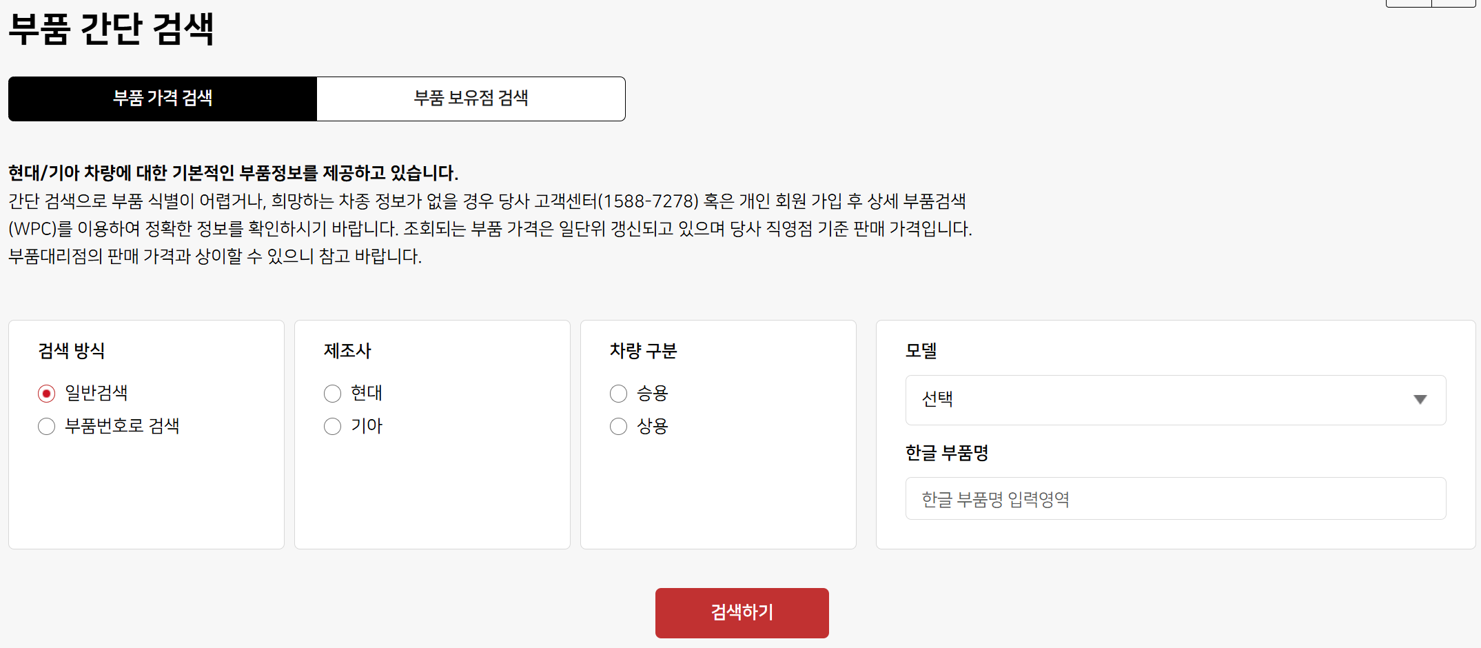 2. 현대모비스 부품 간단 검색 페이지로 들어오게 되는데 원하는 부품 정보를 쉽게 찾을 수 있습니다. 검색 방식은 일반 검색과 부품번호 검색이 있으며 제조사와 차량 종류를 선택한 뒤 모델과 부품명을 입력해 조회할 수 있습니다.