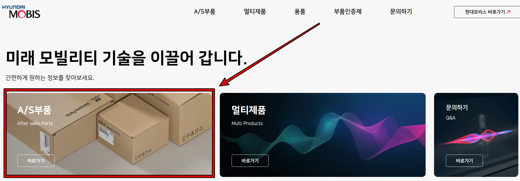 1. 차량의 정보나 차대번호를 입력하면 해당 차량에 맞는 부품을 빠르게 조회할 수 있어 편리하죠. 또한 각 부품에 대한 자세한 정보와 호환성까지 확인할 수 있어 정확한 부품을 선택하는 데 도움이 됩니다. 부품은 ‘A/S부품’ 카테고리로 이동하면 검색 할 수 있습니다.