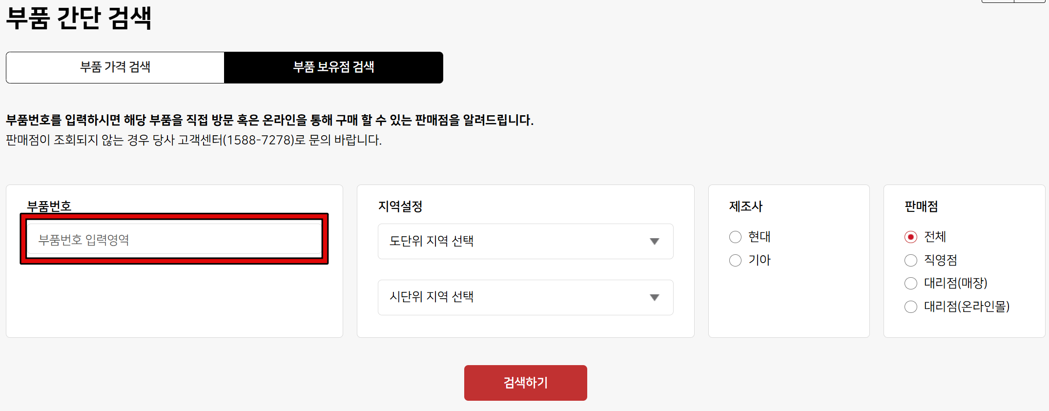 4. 메모한 부품번호를 입력하고 지역, 제조사, 판매점 유형을 선택해 원하는 부품보유점을 찾을 수 있습니다. 입력 후 검색하기를 누릅니다.