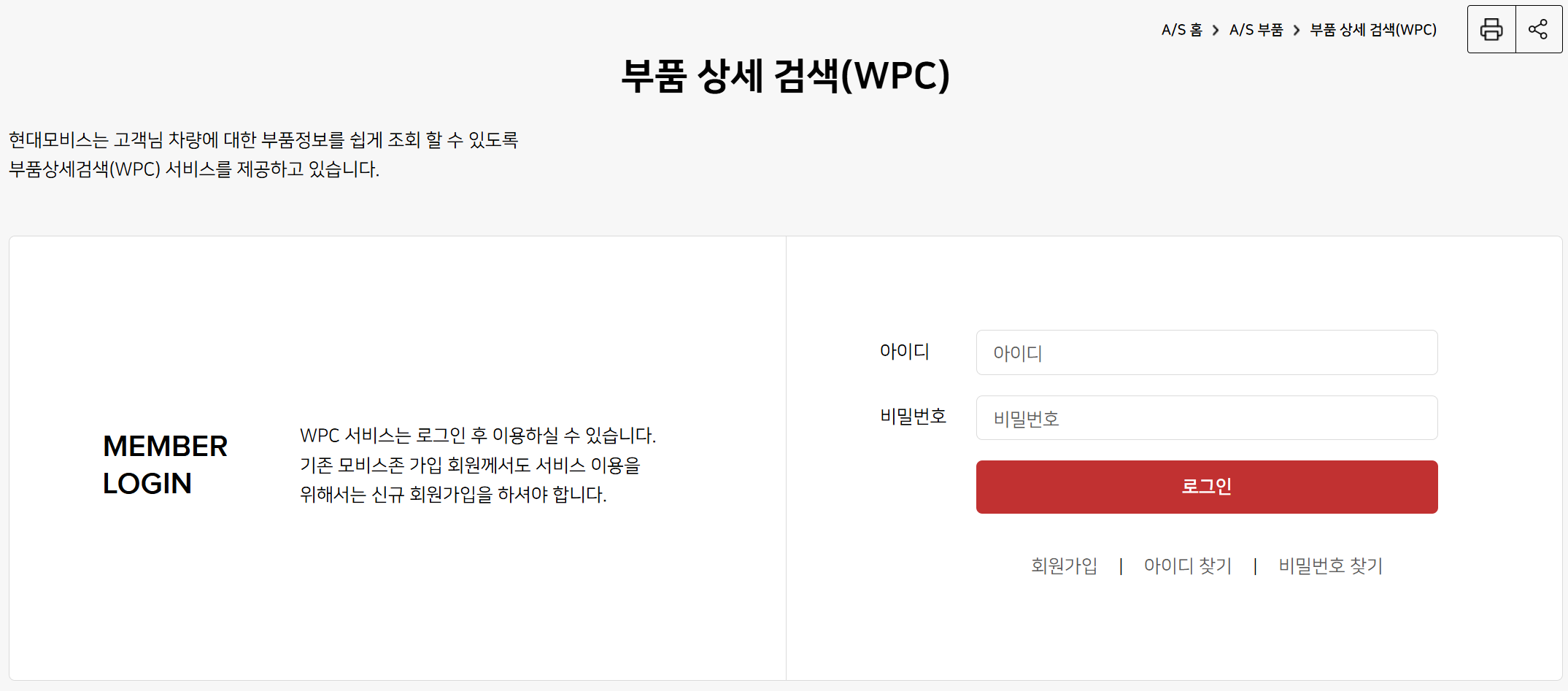 7. 상단의 A/S부품 카테고리에 부품 상세 검색 항목으로 들어오면 차량 부품 정보를 상세하게 조회할 수 있는 WPC 서비스를 이용 할 수 있습니다. 다만 이용하려면 회원 가입이 필요하며 기존 모비스존 가입자도 새로 가입해야 합니다. 로그인 후 다양한 부품 정보를 상세하게 확인할 수 있습니다.