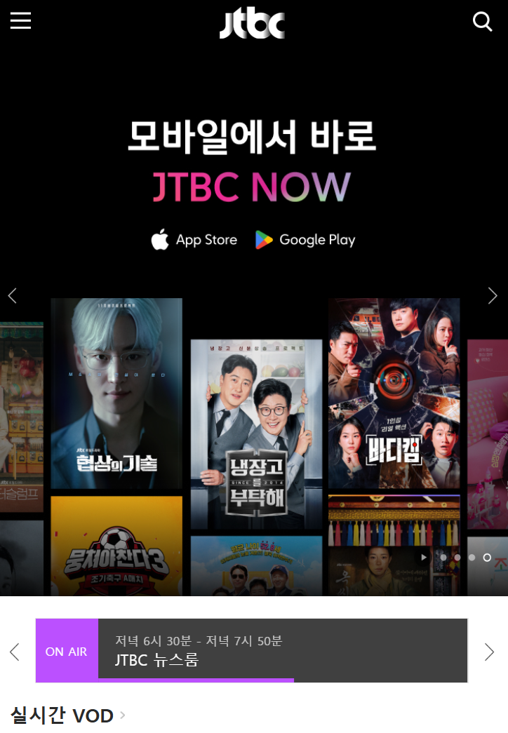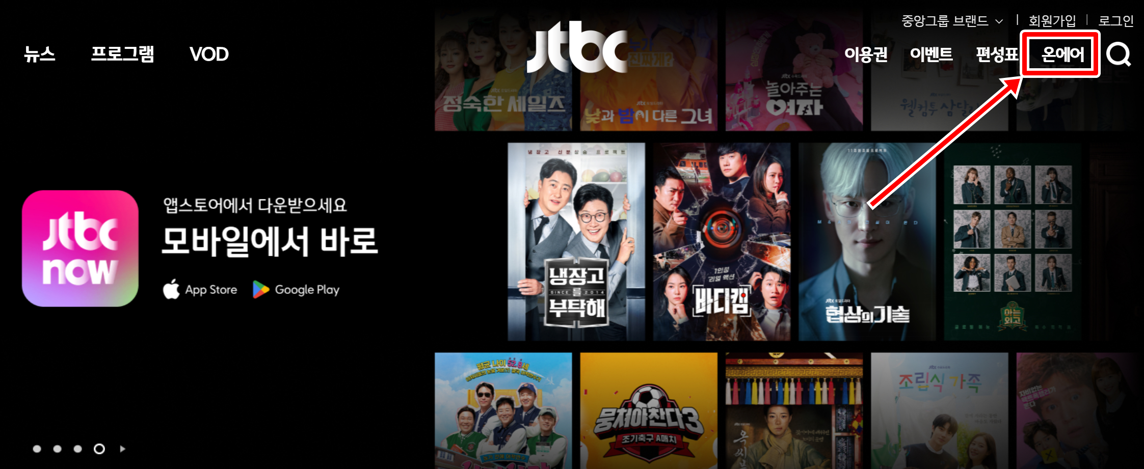 1. JTBC 방송의 다양한 콘텐츠를 한곳에서 확인할 수 있는 곳으로 뉴스, 드라마, 예능 등 다양한 프로그램을 실시간으로 시청하거나 다시 볼 수 있으며 최신 소식도 빠르게 접할 수 있습니다. 화면 상단 온에어로 들어갑니다.