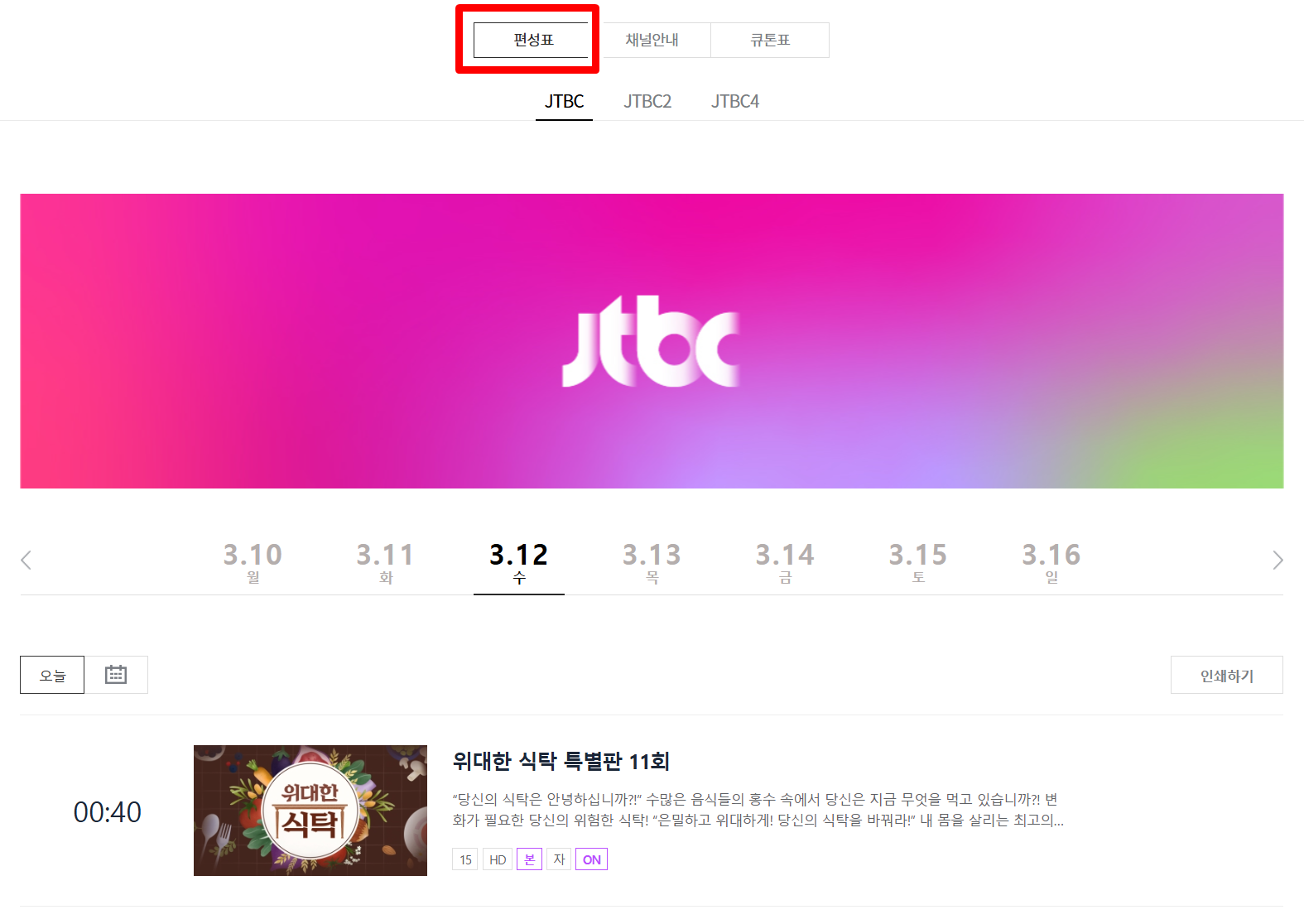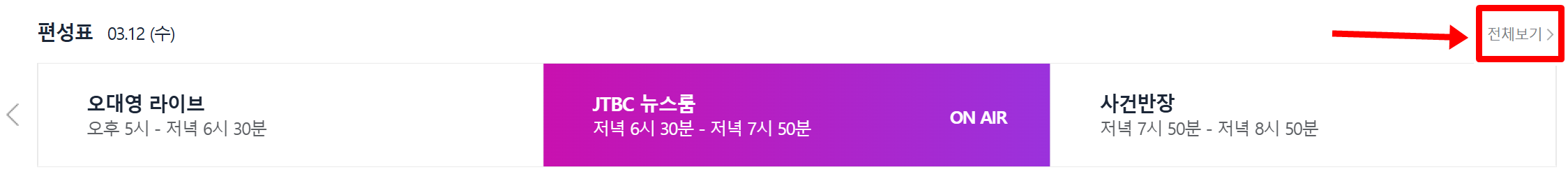 3. 그 밑에는 JTBC의 편성표를 확인 할 수 있는데요. 실시간 방송을 보려면 이 편성표가 도움이 되겠어요.