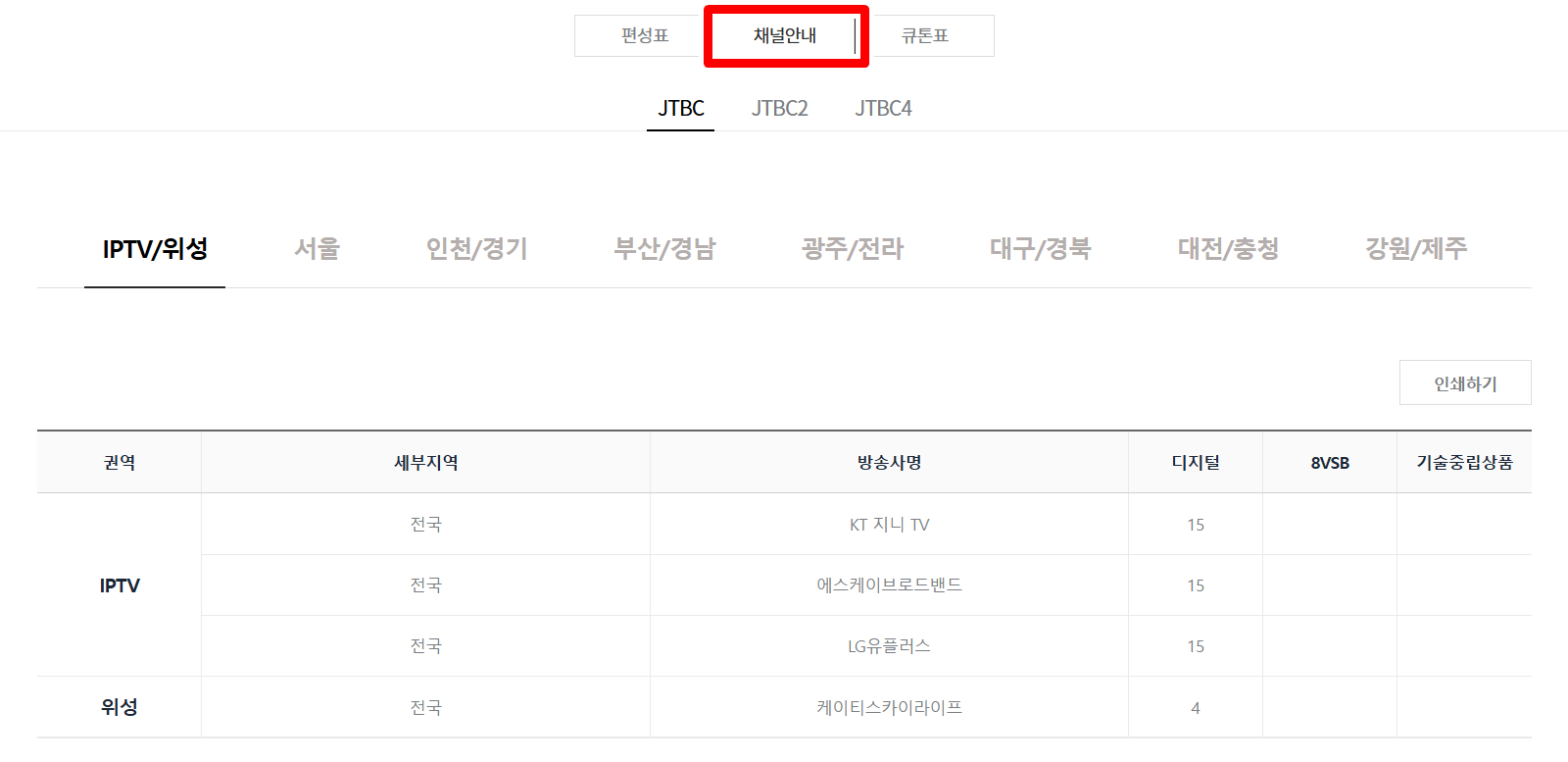 6. 채널 안내로 들어오면 JTBC를 IPTV나 위성 방송에서 볼 수 있는 방법이 정리 되어 있으며 IPTV는 전국 어디서나 KT 지니 TV, SK브로드밴드, LG유플러스를 통해 15번에서 시청할 수 있어요. 위성 방송의 경우 KT스카이라이프에서 4번으로 볼 수 있어요. 원하는 채널을 찾아 편하게 시청할 수 있도록 안내되어 있어요.
