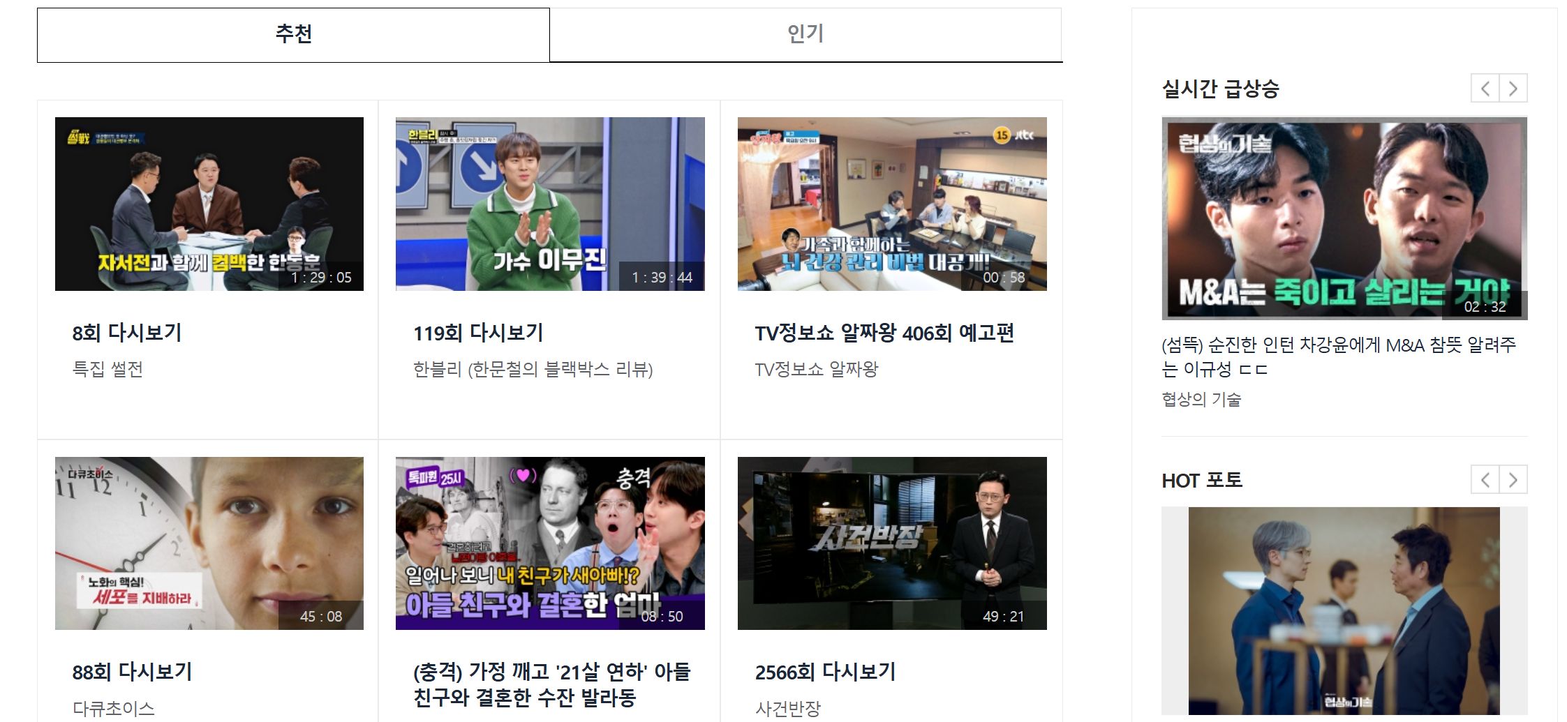 4. 또한 JTBC에서 추천하는 다양한 프로그램이 정리되서 보여줘요. 특집 방송부터 예능, 다큐멘터리, 시사 프로그램까지 다양한 콘텐츠를 한눈에 볼 수 있어요. 특히 주목받고 있는 영상이 함께 소개돼 인기 프로그램의 주요 장면을 쉽게 확인할 수 있도록 구성되어 있어요. 실시간 방송뿐만 아니라 다양한 콘텐츠를 놓치지 않도록 도와줘요.