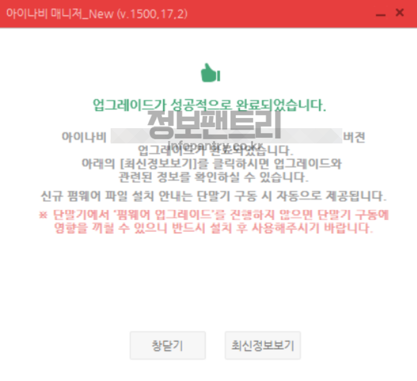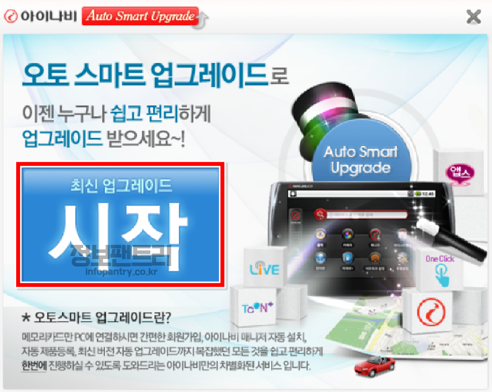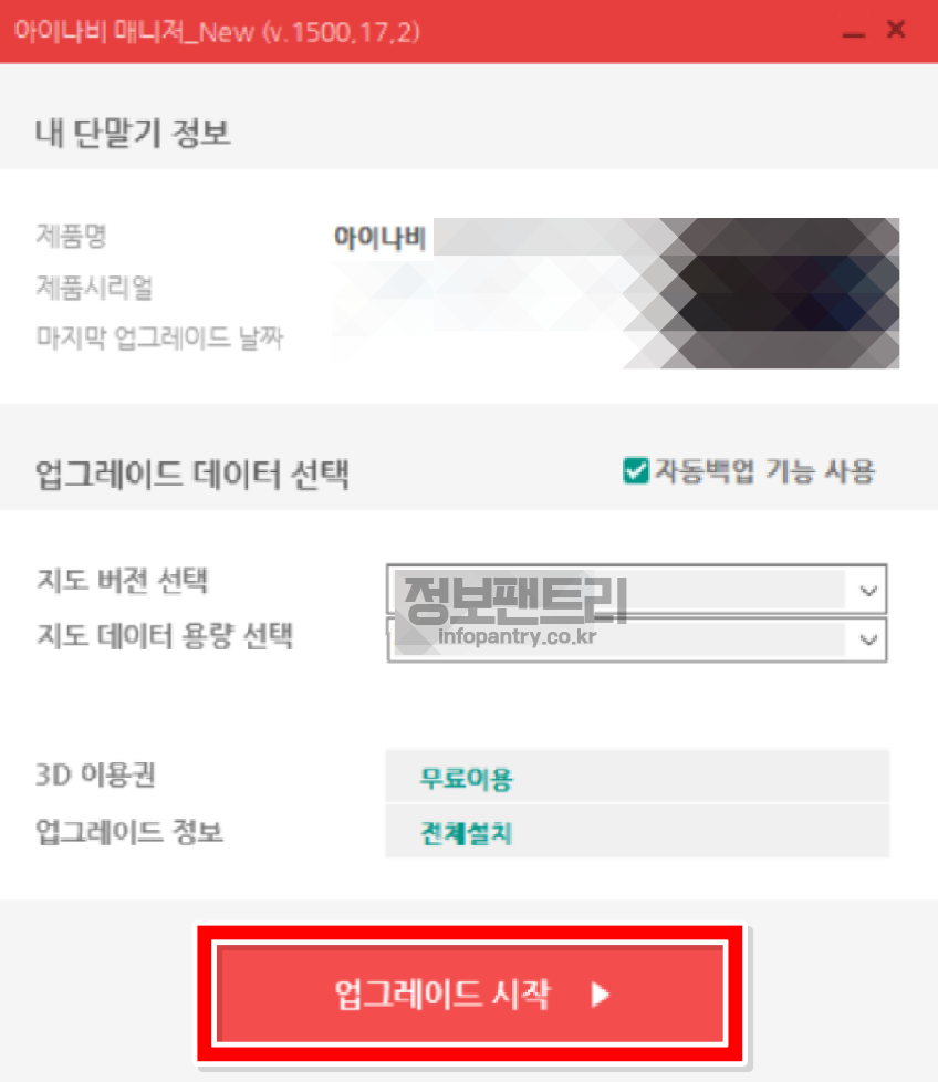 3. 아이나비 매니저 프로그램을 실행하시면 아래와 같은 화면이 나타납니다. 최긴 업그레이드 시작 메뉴를 눌러 진행해주세요.
