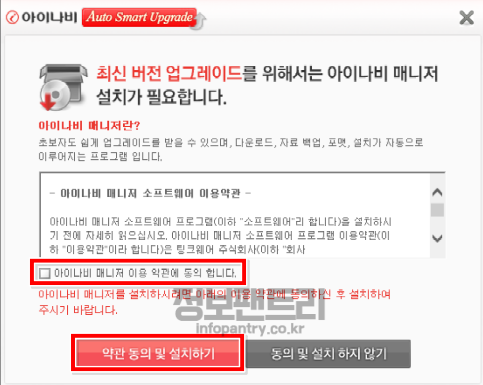 4. 먼저 최신 버전 업그레이드를 위한 아이나비 매니저 이용 약관에 동의 체크를 해주시고, 설치하기 메뉴를 선택하세요.