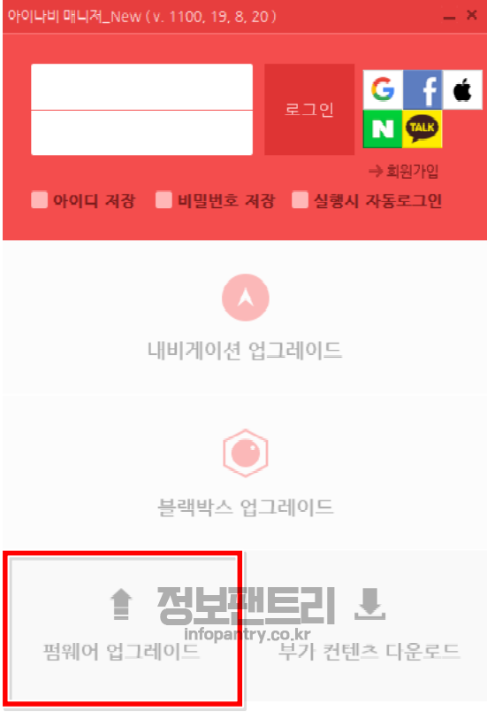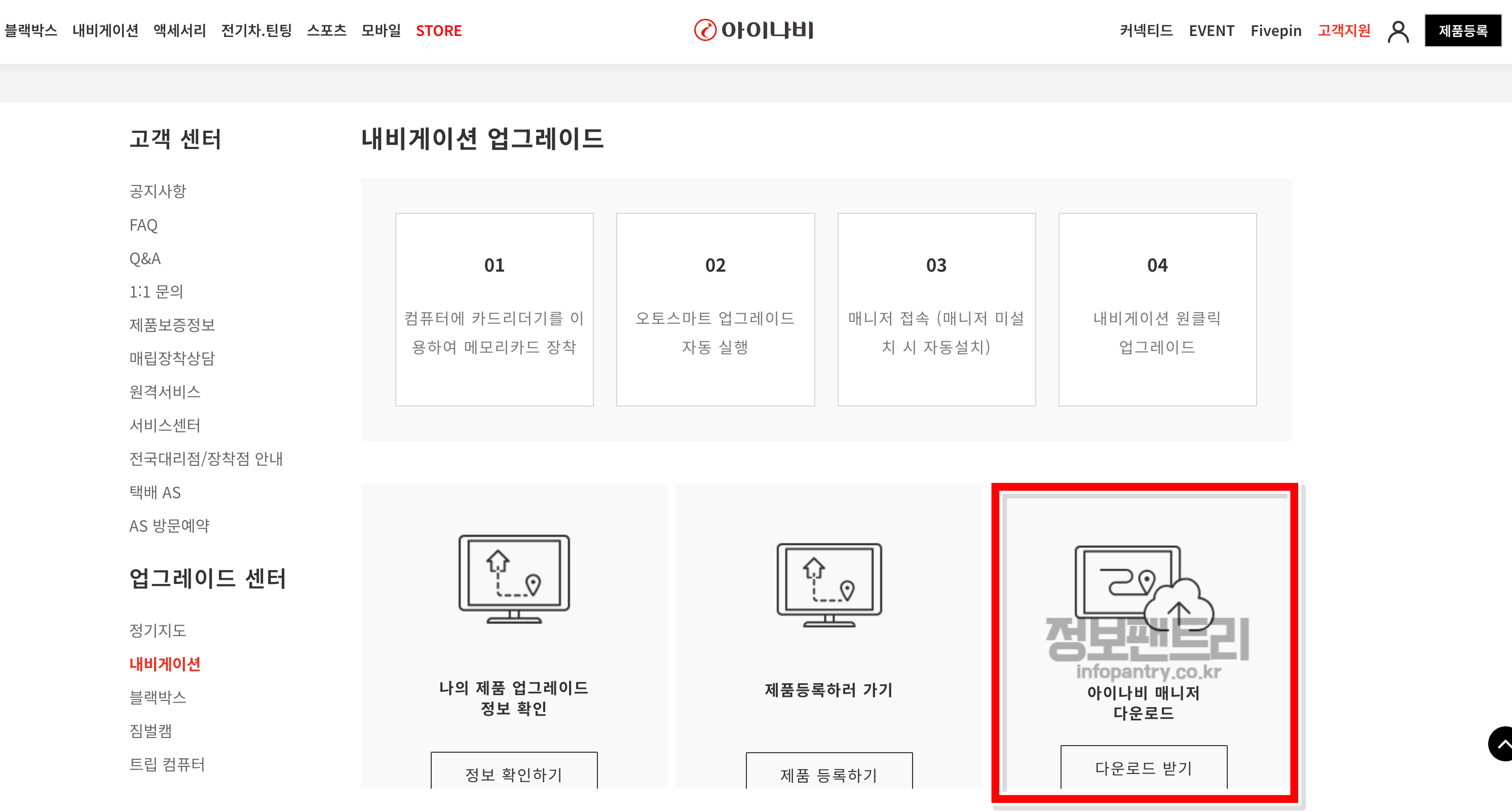 고객지원 내비게이션 업그레이드 안내 내비게이션 업그레이드를 위해서 아이나비 매니저를 설치하여 주십시요. 아이나비 회원가입 후 업그레이드를 진행하실 수 있습니다. 사용하시는 내비게
